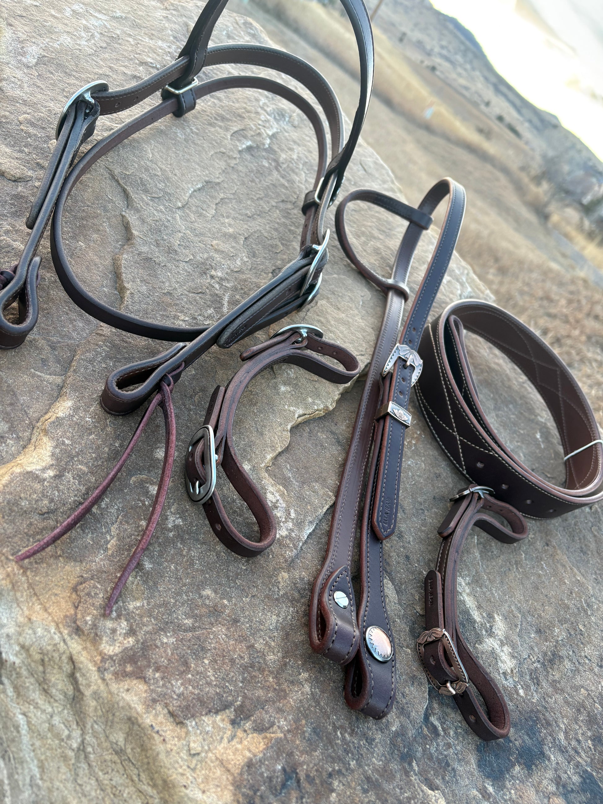 Finished custom belt, 2 curb straps and sliding ear headstall. Thank you!